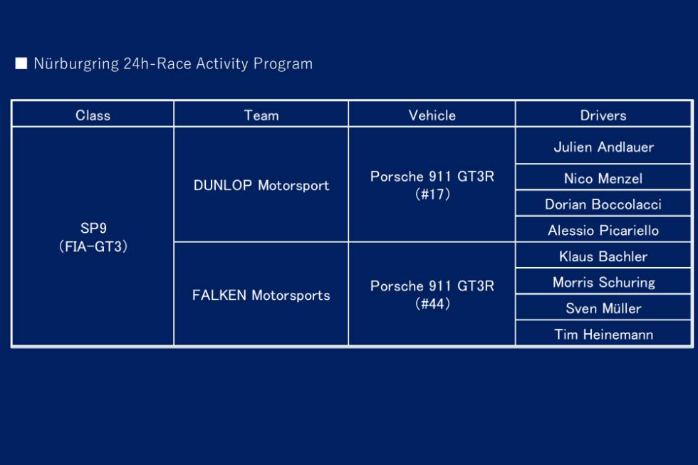 Falken Motorsports, has announced that it will compete in the 2026 ADAC RAVENOL 24h Nürburgring (Nürburgring 24-Hour Endurance Race) with a DUNLOP colored Porsche under the banner of “DUNLOP Motorsport.” The company will field a two-car lineup featuring both the DUNLOP and FALKEN brands.